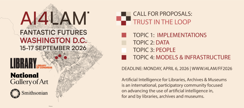 Submissions for the 2026 AI4LAM Fantastic Futures: Trust in the Loop program are due Monday, April 6, 2026.